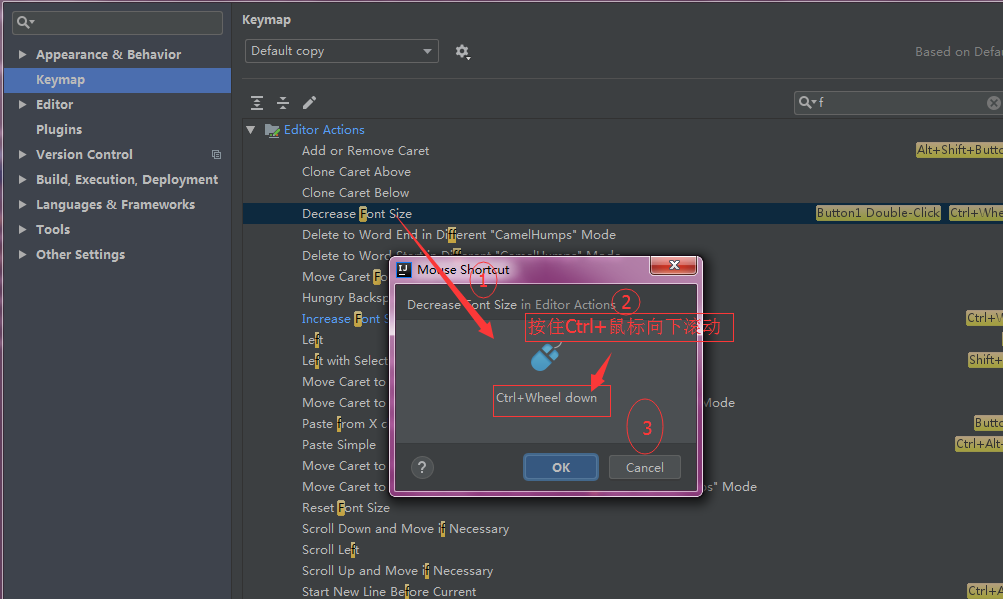 2、配置Decrease Font Size 字体缩小:找到【Decrease Font Size】右键,点击【Add Mouse Shortcut】,在弹出框中按住【Ctrl+鼠标向下滚动】,如下图: