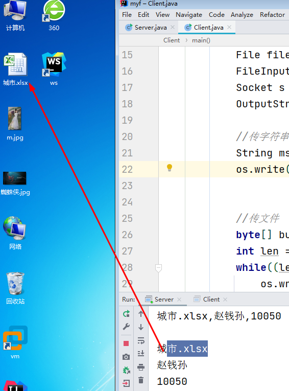 package cn.org; import java.io.FileOutputStream; import java.io.InputStream; import java.net.ServerSocket; import java.net.Socket; import java.util.ArrayList; import java.util.List; public class Server { public static void main(String[] args) { int port = 3399; try { ServerSocket ss = new ServerSocket(port); while (true) { Socket s = ss.accept(); InputStream is = s.getInputStream(); //读取字符串 byte[] bu = new byte[1]; StringBuilder str = new StringBuilder(); String text = ""; List list = new ArrayList(); while (text.indexOf("\r\n") 0) { fos.write(buf, 0, len); } fos.close(); } } catch (Exception e) { e.printStackTrace(); } } } package cn.org; import java.io.*; import java.net.ServerSocket; import java.net.Socket; import java.nio.charset.StandardCharsets; public class Client { public static void main(String[] args) { int port = 3399; try { //建立文件输入流 String fn = "c:/美女.jpg"; String author = "赵六"; File file = new File(fn); FileInputStream is = new FileInputStream(file); Socket s = new Socket("localhost",port); OutputStream os = s.getOutputStream();//字节流 //传字符串 String msg = String.format("%s,%s,%d\r\n",file.getName(),author,file.length()); os.write(msg.getBytes(StandardCharsets.UTF_8)); //传文件 byte[] buf = new byte[1024]; int len = 0; while((len=is.read(buf))>0){ os.write(buf,0,len); } os.close(); } catch (Exception e) { e.printStackTrace(); } } }