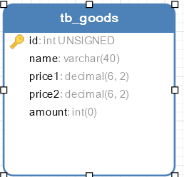 INSERT INTO `tb_goods` VALUES (1, '苹果', 1632.70, 1105.53, 81);