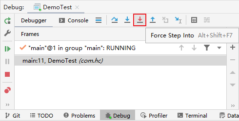 Drop frame 点击该按钮后,将返回到当前方法的调用处(如上图,程序会回到main()中)重新执行,并且所有上下文变量的值也回到那个时候。 只要调用链中还有上级方法,可以跳到其中的任何一个方法。