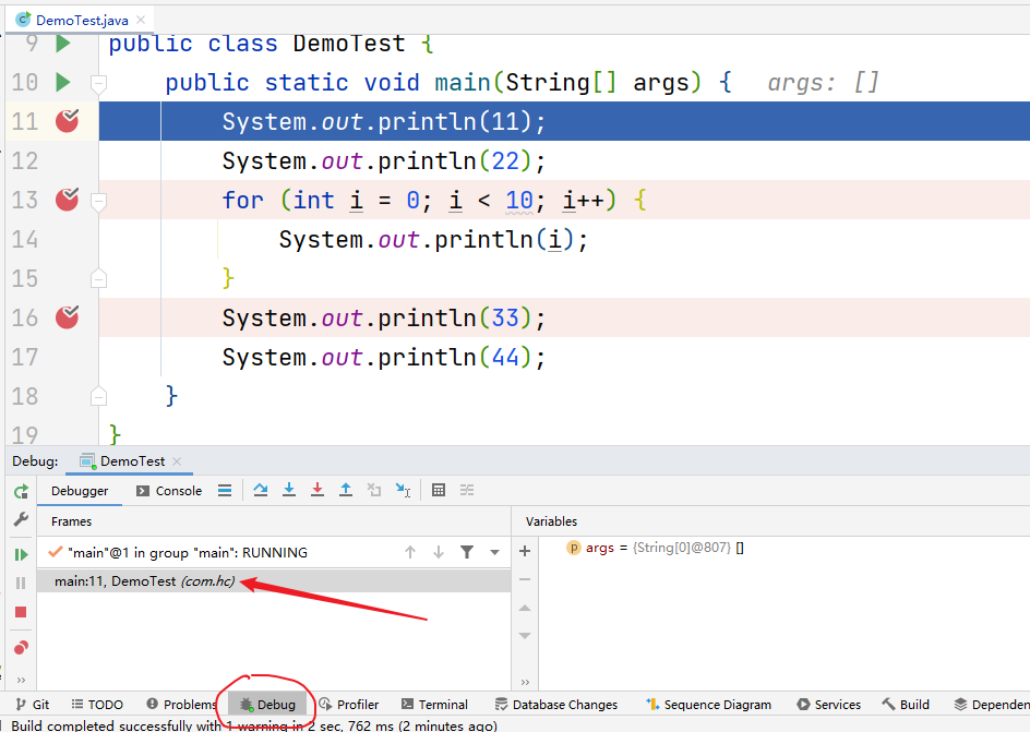 IDE下方出现 Debug 视图,红色的箭头指向的是现在调试程序停留的代码行。