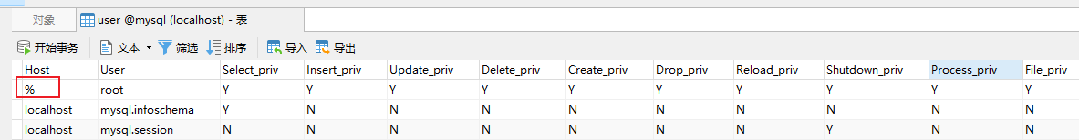 图形化方式修改mysql的mysql数据库的user表,将root的Host设置为%,如下图所示: