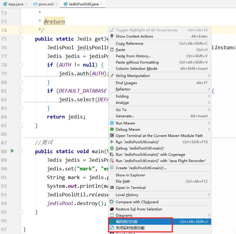 在进行编码时会实时监测,如果觉得该功能太过于干扰工作,可以选择“关闭实时检测功能”。