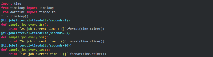 Timeloop是一个库,可用于运行多周期任务。这是一个简单的库,它使用decorator模式在线程中运行标记函数。