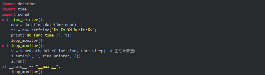 class sched.scheduler(timefunc, delayfunc)这个类定义了调度事件的通用接口,它需要外部传入两个参数,timefunc是一个没有参数的返回时间类型数字的函数(常用使用的如time模块里面的time),delayfunc应该是一个需要一个参数来调用、与timefunc的输出兼容、并且作用为延迟多个时间单位的函数(常用的如time模块的sleep)。