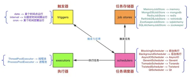 - 调度器(scheduler) 是其他的组成部分。你通常在应用只有一个调度器,应用的开发者通常不会直接处理作业存储、调度器和触发器,相反,调度器提供了处理这些的合适的接口。配置作业存储和执行器可以在调度器中完成,例如添加、修改和移除作业。通过配置executor、jobstore、trigger,使用线程池(ThreadPoolExecutor默认值20)或进程池(ProcessPoolExecutor 默认值5)并且默认最多3个(max_instances)任务实例同时运行,实现对job的增删改查等调度控制