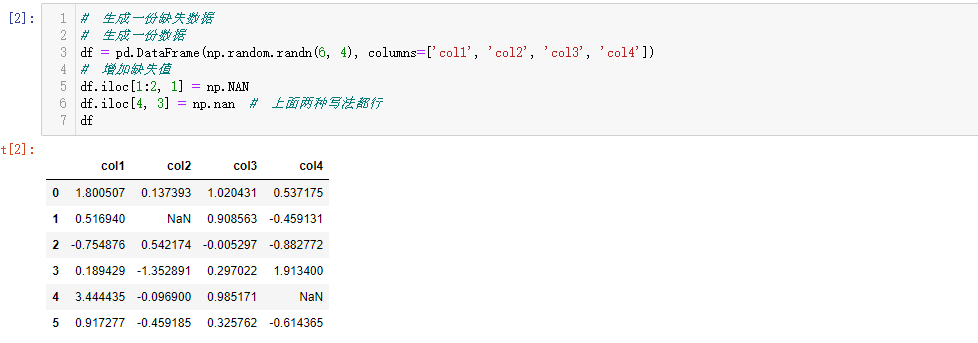 df.iloc[4, 3] = np.nan # 上面两种写法都行