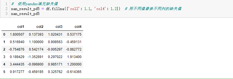 nan_result_pd5 = df.fillna({'col2': 1.1, 'col4': 1.2}) # 用不同值替换不同列的缺失值