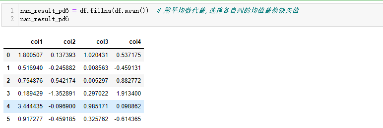 nan_result_pd6 = df.fillna(df.mean()['col2':'col4']) # 用平均数代替,选择各自列的均值替换缺失值