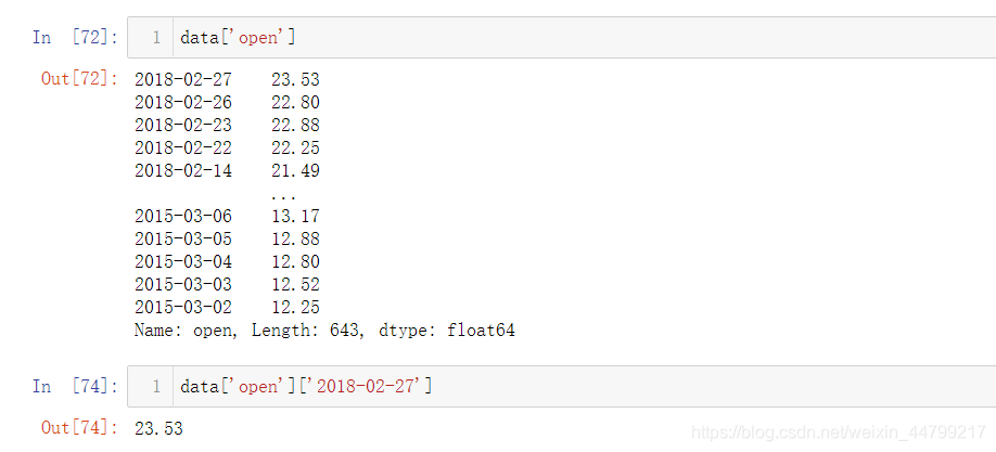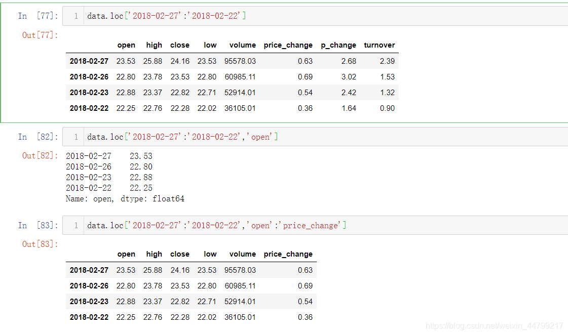 获取从'2018-02-27':'2018-02-22','open'的结果