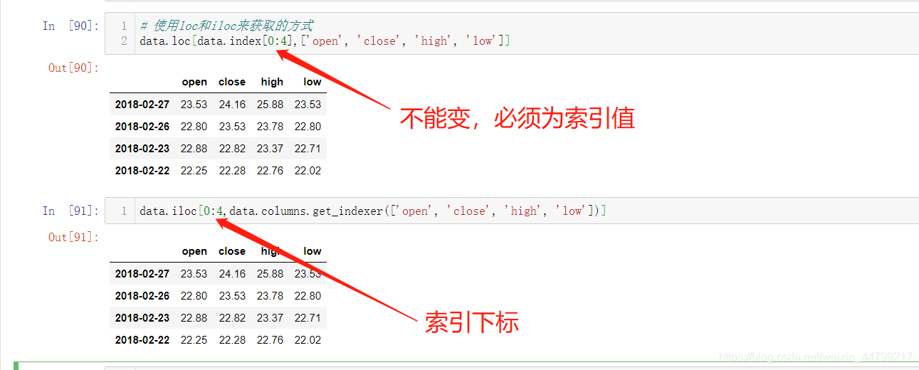 - loc -- 先行后列,是需要通过索引的字符串进行获取