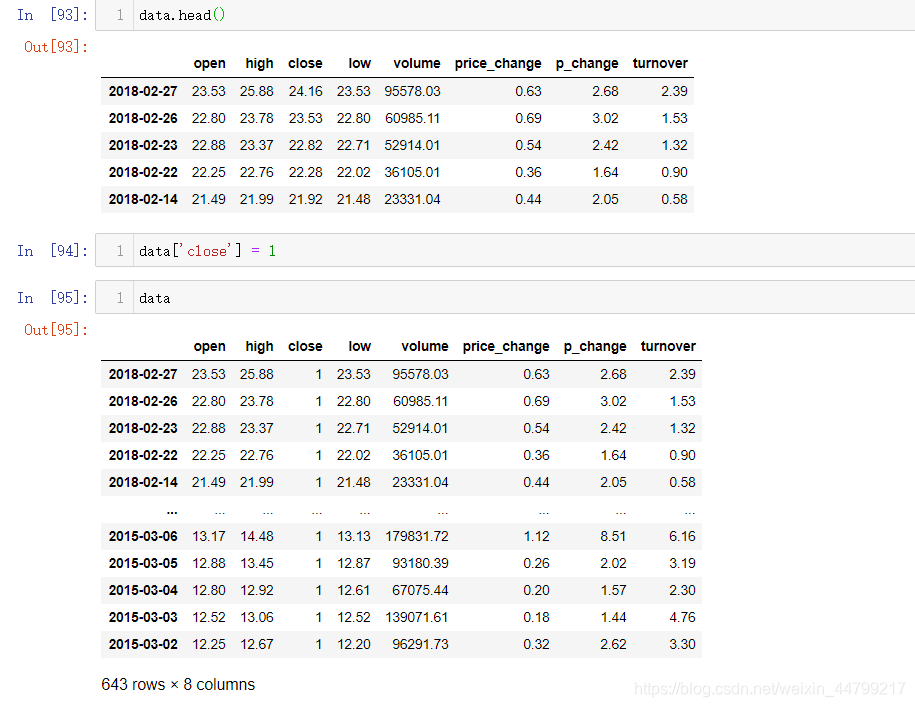 1.1 直接使用行列索引(先列后行)获取'2018-02-27'这天的'close'的结果