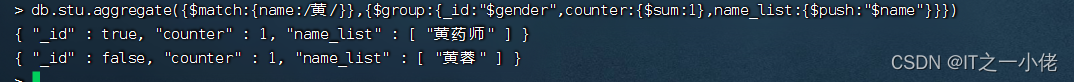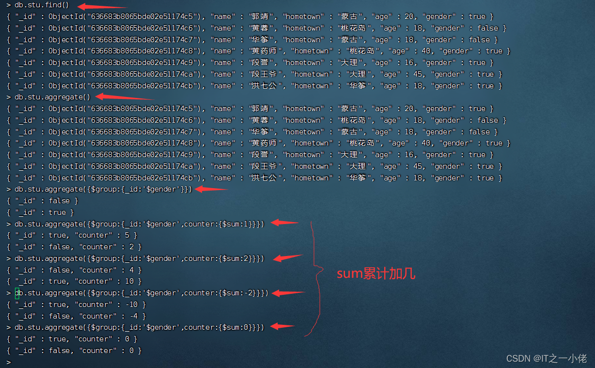 db.db_name.aggregate是语法,所有的管道命令都需要写在其中_id表示分组的依据,按照哪个字段进行分组,需要使用$gender表示选择这个字段进行分组$sum:1表示把每条数据作为1进行统计,统计的是该分组下面数据的条数