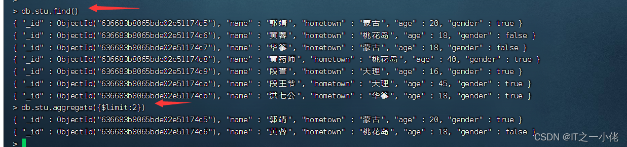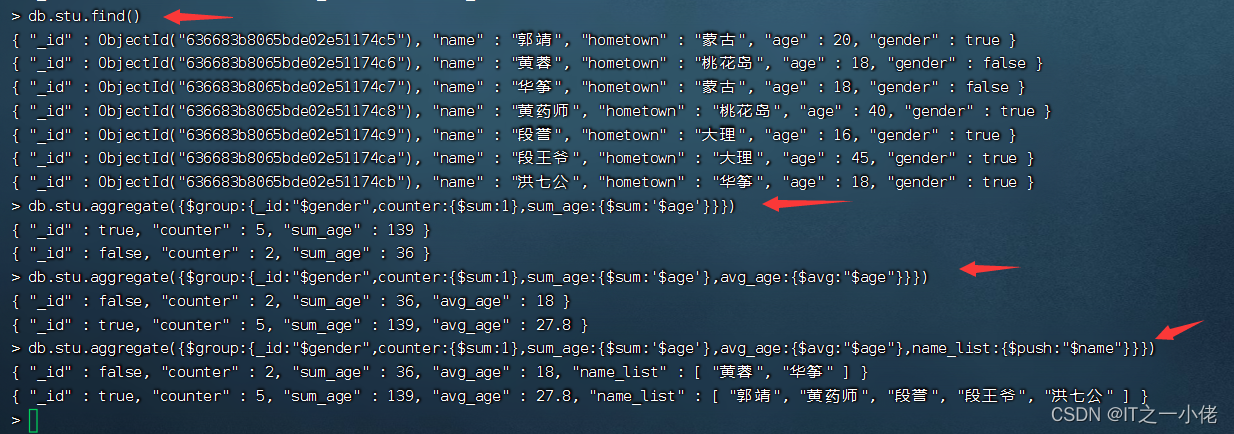 5.1 查询人物的年龄、姓名,仅输出年龄姓名 db.stu.aggregate(