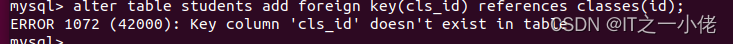 alter table students add foreign key(cls_id) references classes(id); 【首先会验证的,不符合就会报错】