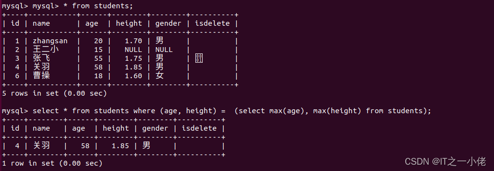 【select * from students where (age, height) = (select max(age),max(height) from students;】