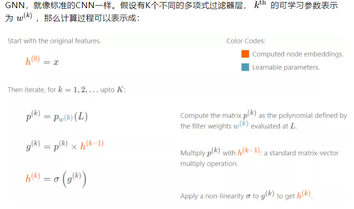 GNN和CNN计算方式类似,将输入作为初始features,然后计算多项式过滤器,然后和输入特征进行矩阵相乘,最后用非线性函数进行非线性变换,循环迭代K次。