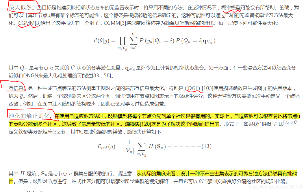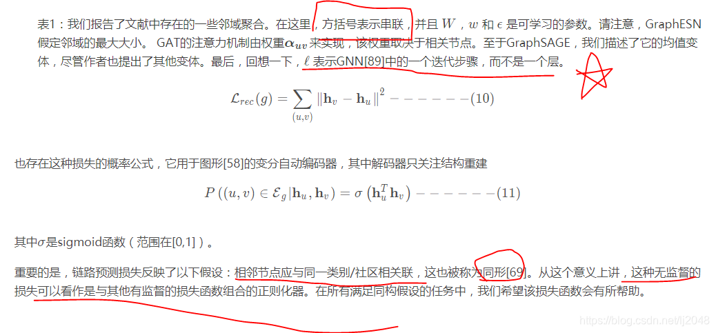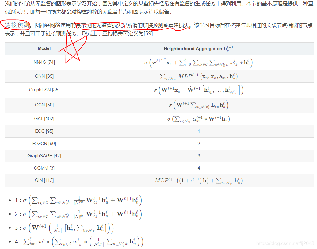 4.1 无监督(连接预测-概率->贝叶斯-最大似然)图7:用于节点和图分类的两种可能的架构(前馈和递归)。在每一层内部,可以应用本节中介绍的注意力和采样技术。应用池化之后,就无法再执行节点分类,这就是为什么用于节点分类的潜在模型可以简单地组合图卷积层的原因。循环体系结构(底部)迭代地应用相同的邻域聚合,直到满足收敛标准为止。