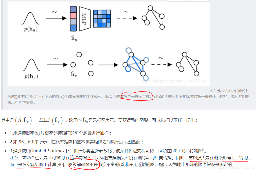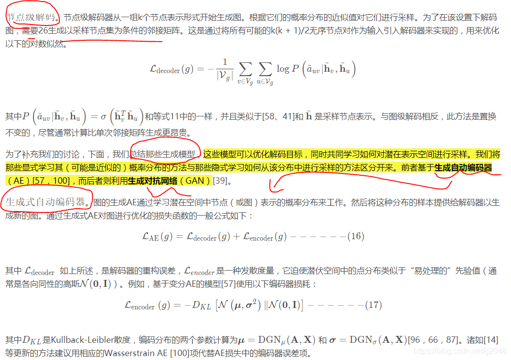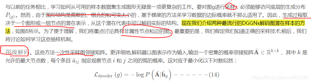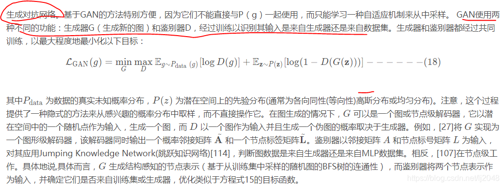 5.5、图的顺序生成模型生成图的另一个可行选择是将生成过程建模为一系列动作。事实证明,这种方法能够概括来自非常不同的训练分布的图形。但是,它依赖于图节点的固定顺序。文献[65]中的方法是一种开创性的方法,其中图的生成被建模为决策过程。具体来说,共同训练一堆神经网络,以了解是否要添加新节点,是否要添加新边缘以及要关注下一个迭代的节点。另一个有趣的工作是[121],其中将生成公式化为自回归过程,其中将节点顺序添加到现有图。每次添加新节点时,节点级别的门控循环单元(GRU)网络都会预测其相对于现有节点的邻接矢量。同时,图级GRU网络跟踪整个图的状态,以调节邻接矢量的生成。最后,[5,4]通过学习使用两个GRU网络预测图的有序边集来对生成任务进行建模。第一个生成边缘的第一个端点,而第二个则根据这些信息预测缺失的端点。