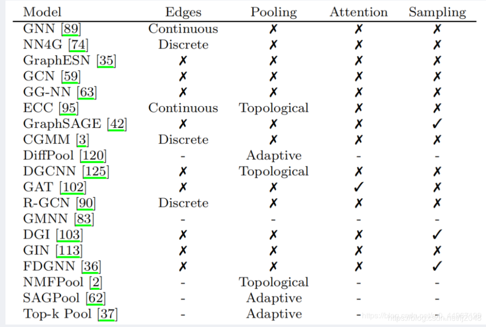 在本节的最后,我们将根据到目前为止讨论的构建块和任务提供一些局部迭代模型的特征。具体来说,表2针对四个关键属性对模型进行了区分:上下文扩散方法、如何计算嵌入、如何构造层以及方法的性质。然后,我们添加了模型可能具有或不具有的其他属性,例如处理边缘、执行池化、参与邻居和对邻居进行采样的能力。