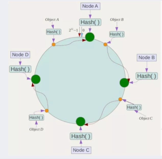 2^{32}-1 232−1的值,这些值构成一个hash空间。将它们顺序排列且首尾相连,构成一个环形空间(Hash环)
