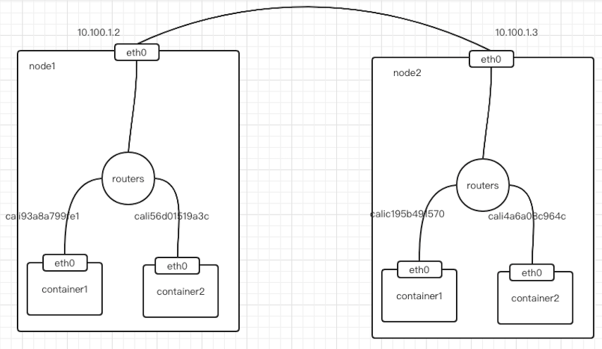 如图可以看到当 node1 上 container-1 要发数据给 node2 上的 container2 时,会匹配到如下的路由表规则:
