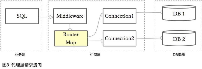 代理层的数据库中间件,将自己伪装成一个数据库,接受业务端的链接。然后负载业务端的请求,解析或者转发到真正的数据库中。