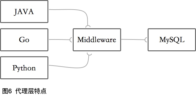 典型实现代理层中间件正好相反。仅支持一种后端关系型数据库,但支持多种开发语言。如果你的系统是异构的,并且都有同样的SLA要求,则推荐使用此方案。