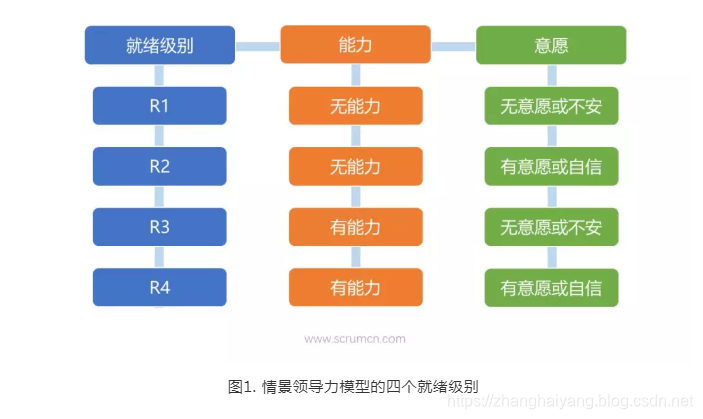 几年前,我把几个高尔夫球打到湖里了,一起打球的朋友给了我一些建议。现在那位朋友打高尔夫球已经不比我强了,但他仍在没完没了地建议。他说,“问题是,你得把球打得更远。”他这样说还不如告诉我,“问题是,你打了很多次才把球打进球洞”。我当然需要打得更远。但怎么做到呢?类似的,你们可能也被告诫过——ScrumMaster、敏捷教练或敏捷项目经理都可能告诫你——敏捷项目管理是要领导团队而非管理团队。然而,指导ScrumMaster“要领导而非管理”,并不是什么有信息含量的指导。这相当于告诉高尔夫球手要把球打得更远。这是正确然而没有可操作性的指导。如何才能最好地领导那些想变得敏捷的团队,ScrumMaster们想理解这一点,首先要理解团队需要什么样的领导力,然后看看提供领导力的四种不同方法。这源于保罗·赫塞(Paul Hersey)的情景领导力模型。赫塞的模型为要采用新工作方式的团队,描述了四个就绪级别,如图1所示: