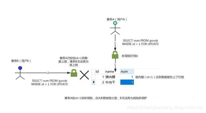 4.1、悲观锁解决利用悲观锁的解决思路是,我们认为数据修改产生冲突的概率比较大,所以在更新之前,我们显示的对要修改的记录进行加锁,直到自己修改完再释放锁。加锁期间只有自己可以进行读写,其他事务只能读不能写。A下单前先给猪肉脯这行数据(id=1)加上悲观锁(行锁)。此时这行数据只能A来操作,也就是只有A能买。B想买就必须一直等待。当A买好后,B再想去买的时候会发现数量已经为0,那么B看到后就会放弃购买。那么如何给猪肉脯也就是id=1这条数据加上悲观锁锁呢?我们可以通过以下语句给id=1的这行数据加上悲观锁。