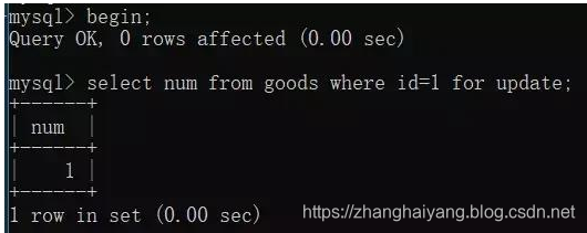 1、事务A执行命令给id=1的数据上悲观锁准备更新数据