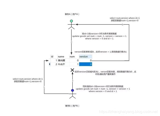 使用乐观锁的解决思路是,我们认为数据修改产生冲突的概率并不大,多个事务在修改数据的之前先查出版本号,在修改时把当前版本号作为修改条件,只会有一个事务可以修改成功,其他事务则会失败。A和B同时将猪肉脯(id=1下面都说是id=1)的数据查出来,然后A先买,A将id=1和version=0作为条件进行数据更新,即将数量-1,并且将版本号+1。此时版本号变为1。A此时就完成了商品的购买。最后B开始买,B也将id=1和version=0作为条件进行数据更新,但是更新完后,发现更新的数据行数为0,此时就说明已经有人改动过数据,此时就应该提示用户重新查看最新数据购买。下面是乐观锁的加锁图解