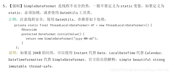 一、SimpleDateFormat作用:进行时间的格式化输出和解析(注意:SimpleDateFormat并不是一个线程安全的类。在多线程情况下,会出现异常!)。《阿里巴巴开发手册》对于SimpleDateFormat的使用有如下强制规范: