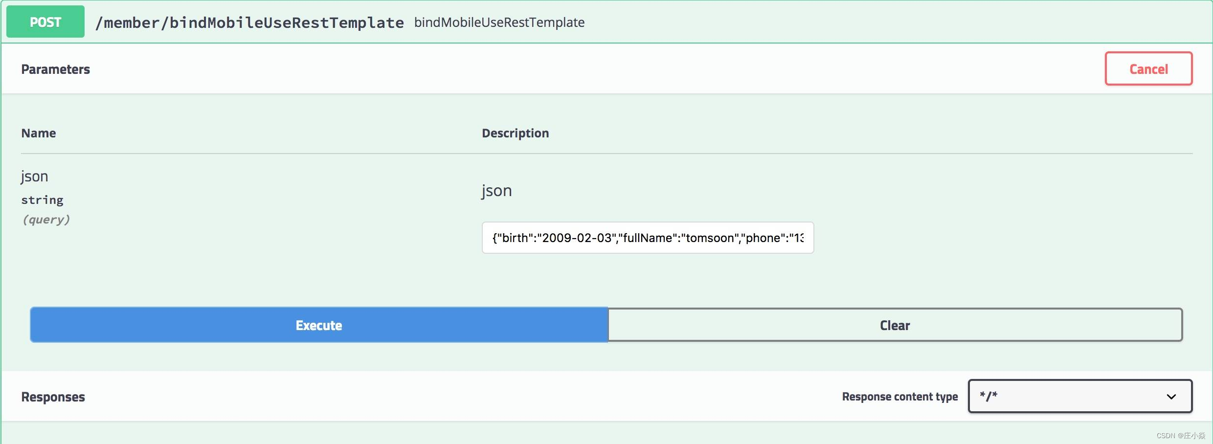 - 通过 parking-member 的 swagger-ui 界面,调用会员绑定手机号接口(或采用 PostMan 工具)