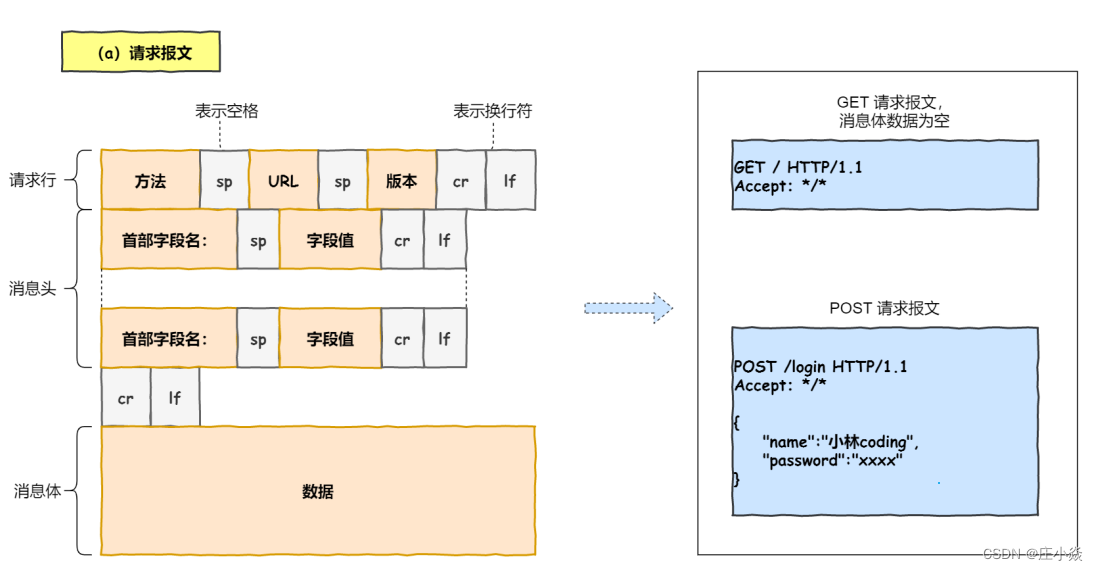 TCP 协议⾥⾯会有两个端⼝,⼀个是浏览器监听的端⼝(通常是随机⽣成的),⼀个是 Web 服务器监听的端⼝ (HTTP 默认端⼝号是 80 , HTTPS 默认端⼝号是 443 )。在双⽅建⽴了连接后,TCP 报⽂中的数据部分就是存放 HTTP 头部 + 数据,组装好TCP报⽂之后,就需交给下⾯的网络层处理。
