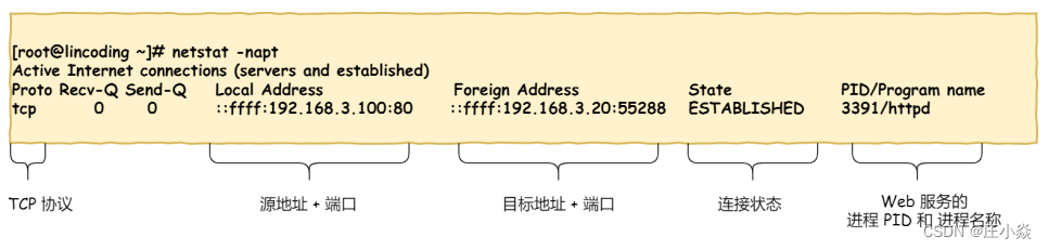 TCP 的连接状态查看,在 Linux 可以通过 netstat -napt 命令查看。