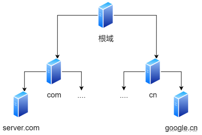 - 根 DNS 收到来自本地 DNS 的请求后,发现后置是 .com,说:“www.server.com 这个域名归 .com 区域管 理”,我给你 .com 顶级域名服务器地址给你,你去问问它吧。”