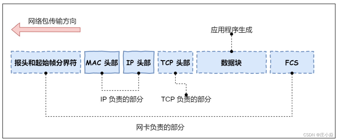 ⽹卡驱动从IP 块获取到包之后,会将其复制到网卡内的缓存区中,接着会在其开头加上报头和起始帧分界符, 在末尾加上⽤于检测错误的帧校验序列。