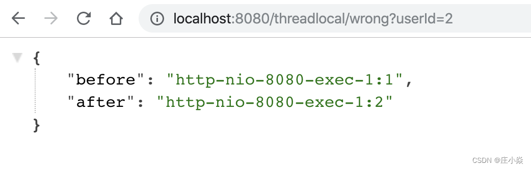 随后用户 2 来请求接口,这次就出现了 Bug,第一和第二次获取到用户 ID 分别是 1 和 2,如果是按照正常的来说数的应该是的null和2。显然第一次获取到了用户 1 的信息,原因就是Tomcat 的线程池重用了线程。从图中可以看到,两次请求的线程都是同一个线程:http-nio-8080-exec-1。