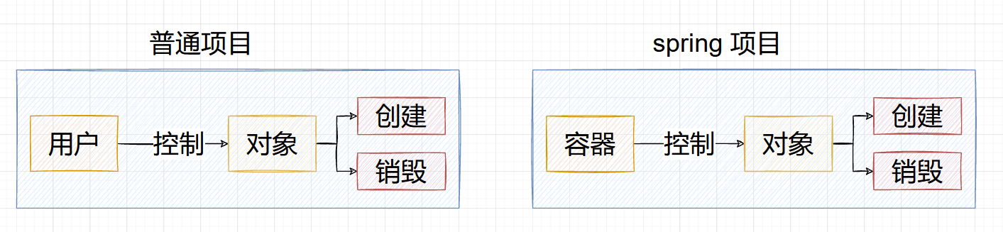在以前,对象的创建和销毁都是由用户控制的,用了ioc之后,对象的创建和销毁就都交给容器来控制了,用户就不用管这些,只关注业务需求就好了;