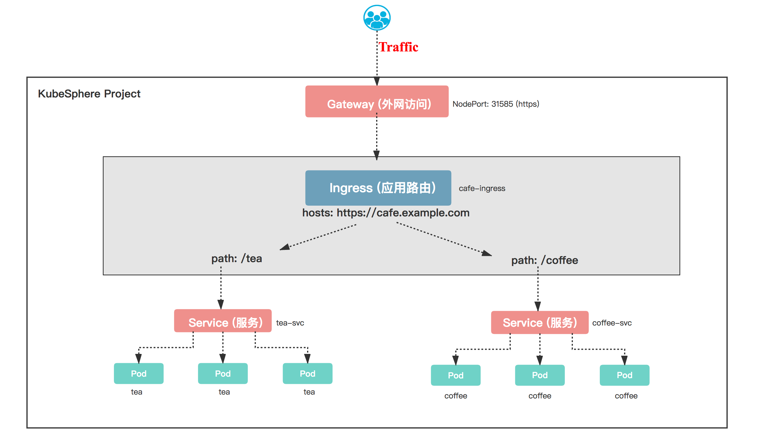 ,则返回 “茶水点餐系统”。这两个系统分别由后端的 coffee 和 tea 这两个部署 (Deployment) 来提供服务。以下将在 KubeSphere 创建相关资源来说明这个应用路由的示例。