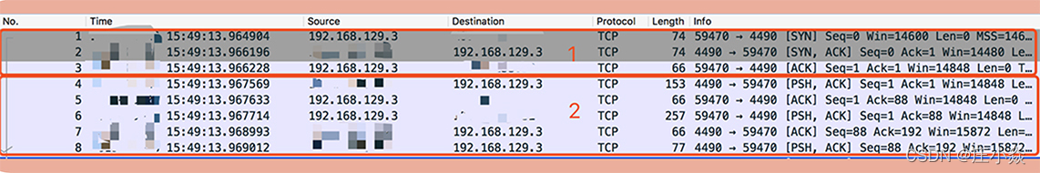 第一部分是前三个数据包。第一个数据包是客户端向服务端发送的一个“SYN”包,第二个包是服务端回给客户端的“ACK”包以及一个“SYN”包,第三个包是客户端回给服务端的“ACK”包,熟悉 TCP 协议的同学可以看出这是一个 TCP 的三次握手过程。