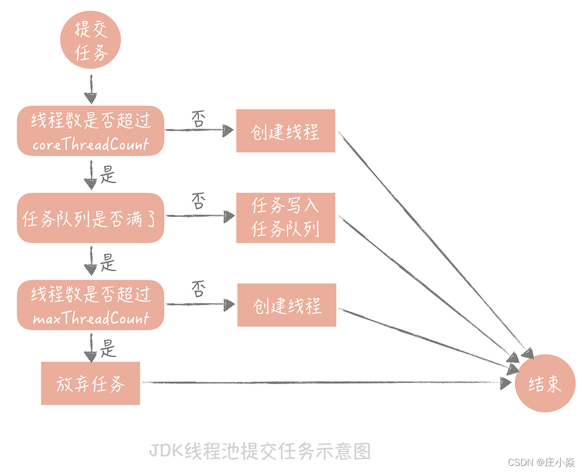 - 当线程数达到 maxTheadCount 时还有新的任务提交,那么我们就不得不将它们丢弃了。