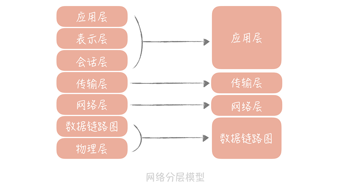 工作中经常能用到 TCP/IP 协议,它把网络简化成了四层,即链路层、网络层、传输层和应用层。每一层各司其职又互相帮助,网络层负责端到端的寻址和建立连接,传输层负责端到端的数据传输等,同时呢相邻两层还会有数据的交互。这样可以隔离关注点,让不同的层专注做不同的事情。