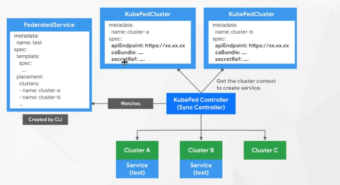 如果想新增一种要被联邦托管的资源的话,就需要建立一个新的FederatedXX的CRD,用来描述对应资源的结构和分发策略(需要被分发到哪些集群上); Federated Resource CRD主要包括三部分: