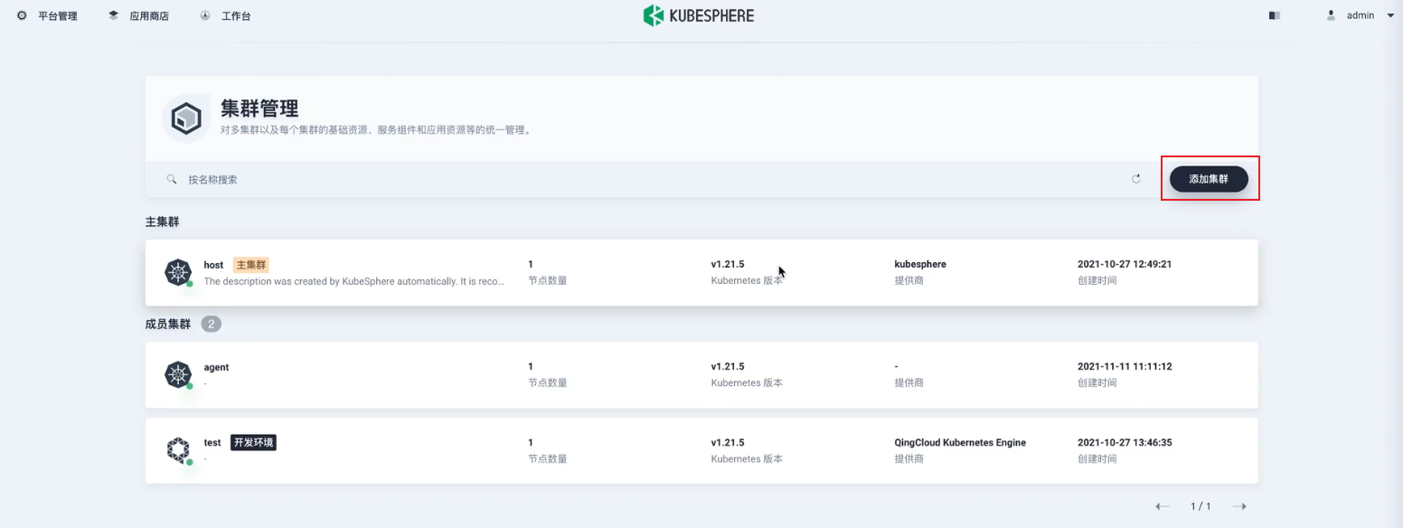 第二种是代理连接;对于Host集群到Member集群网络不可达的情况,目前kubefed还没有办法做到联邦。因此KubeSphere开源了Tower组件,实现了私有云场景下集群联邦管理,用户只需要在私有集群创建一个agent就可以实现集群联邦。