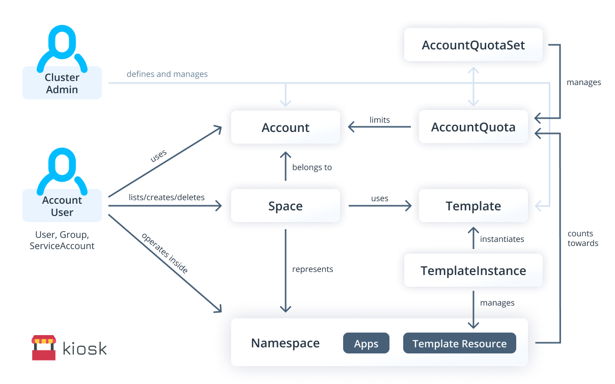 3.2 构建弹性多租户资源管理策略Kubernetes 内部的账号系统有 User、Group、ServiceAccount,当我们通过 RBAC 授权获得资源权限之后,其实这 3 个资源的权限能力是一样的。因为使用场景的不同,针对人的权限,我们一般会提供 User、Group 对象。当面对 Pod 之间,或者是外部系统服务对 Kubernetes API 的调用时,一般会采用 ServiceAccount。在原生 Kubernetes 环境下,我们可以通过 Namespace 把账号和资源进行绑定,以实现基于 API 级别的多租户。但是原生的多租户配置过于繁琐,一般我们会采用一些辅助的开源多租户工具来帮助我们,例如 Kiosk 多租户扩展套件:通过 Kiosk 的设计流程图,我们可以清晰地定义每一个用户的权限,并配置合理的资源环境。让原来繁琐的配置过程简化成默认的租户模板,让多租户的配置过程变得更标准。