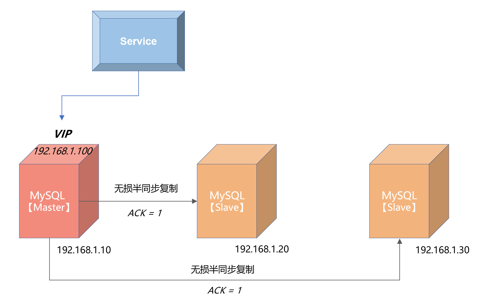 从上图可以看到,MySQL 的主服务器的 IP 地址是 192.168.1.10,两个从服务器的 IP 地址分别为 192.168.1.20、192.168.1.30。上层服务访问数据库并没有直接通过物理 IP 192.168.1.10,而是访问 VIP,地址为192.168.1.100。如果 MySQL 数据库主服务器发生宕机,会进行如下的处理: