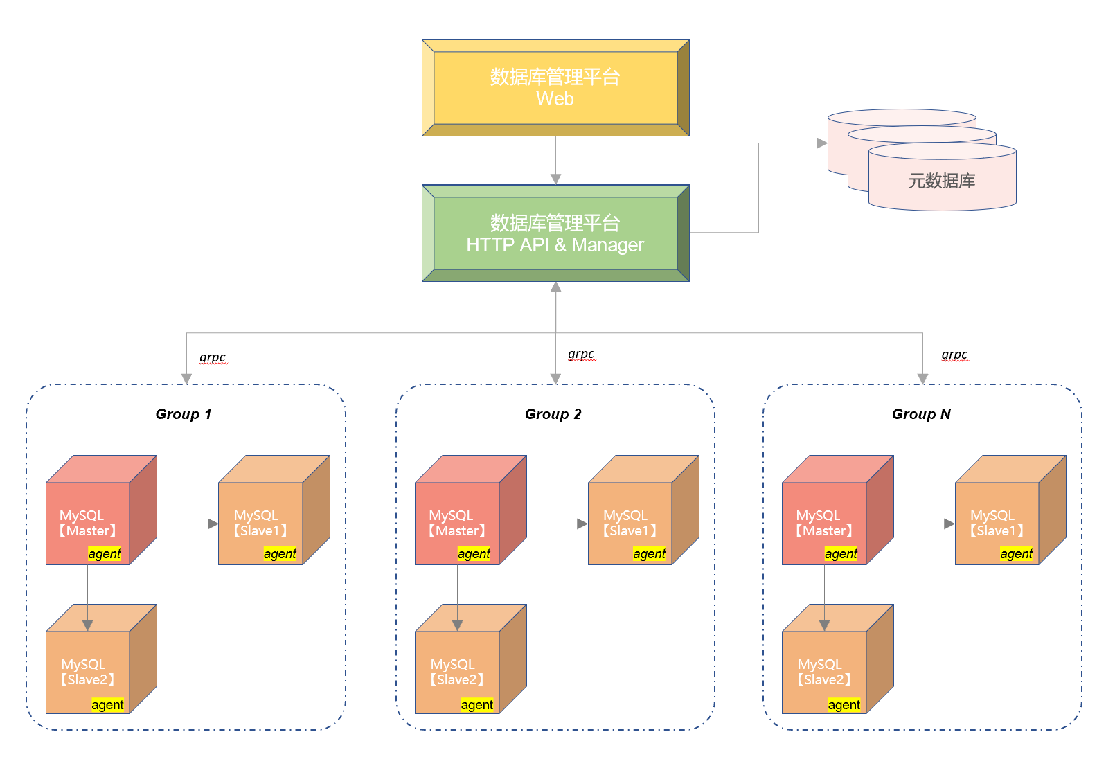数据库管理平台 Manager 用来实际控制下面的所有 MySQL 节点,Manager 和后端 MySQL 的通信通过 MySQL 服务器上部署的 agent 方式进行。两者通过 BP 协议以 grpc 的方式通信。这样解决了 ssh 的不安全性以及性能。
