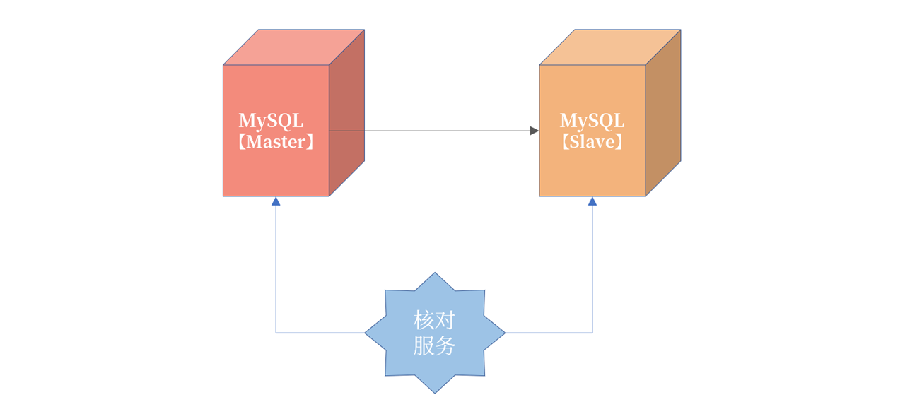 主从服务器之间的核对,是由数据库团队负责的。 需要额外写一个主从核对服务,用于保障主从数据的一致性。这个核对不依赖复制本身,也是一种逻辑核对。思路是:将最近一段时间内主服务器上变更过的记录与从服务器核对,从逻辑上验证是否一致。其实现如图所示: